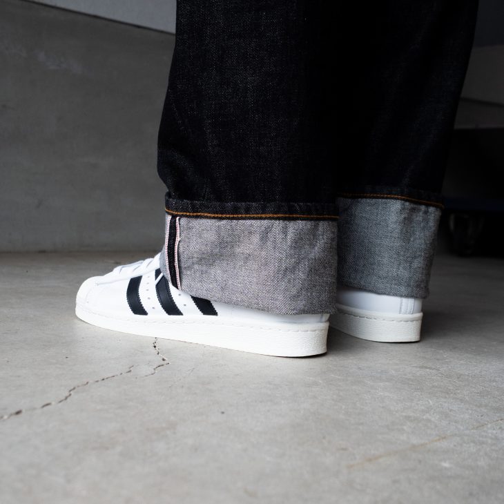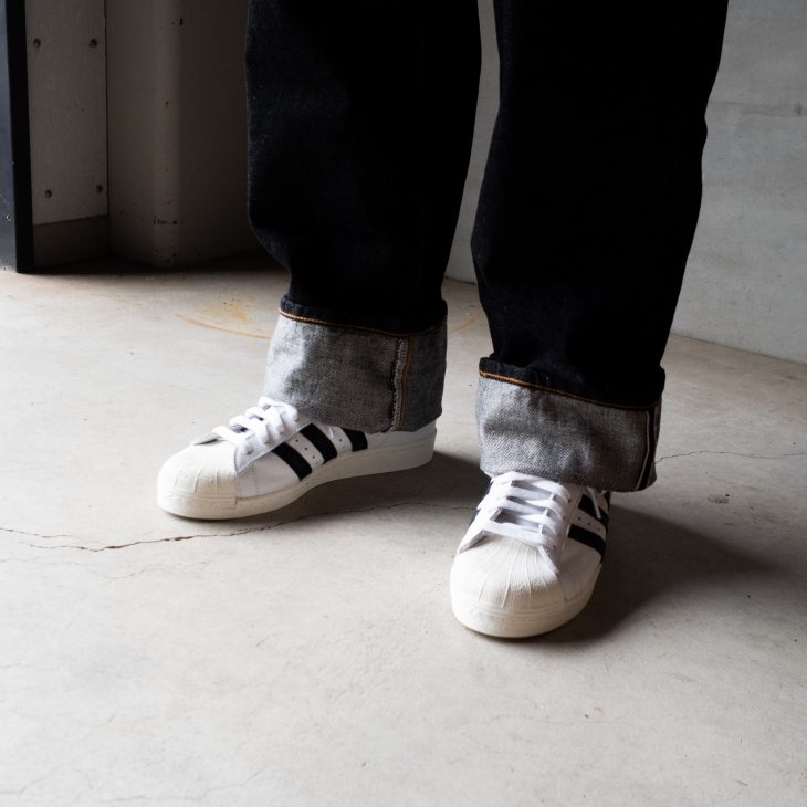 SUPERSTARの存在感に負けないように、ブラックジーンズを太めのロールアップで合わせてみました。