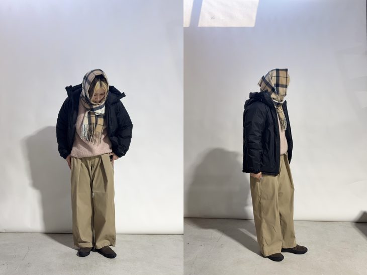 また、ダウンジャケットは現代ファッションに馴染みやすいシルエットで、スタイリングに落とし込みやすくなっています。