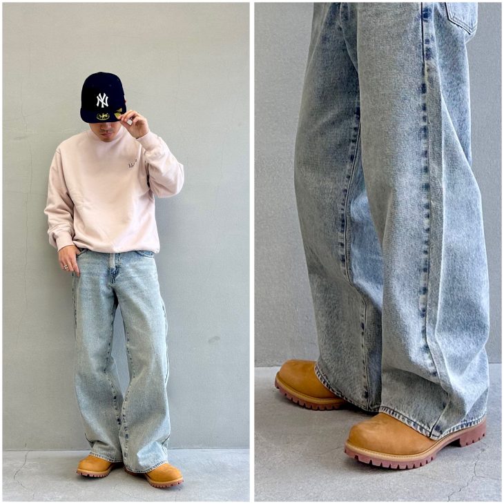 ボトムの裾をブーツに入れる”ブーツインスタイル”も往年のスタイルでかっこいいですが、トレンド感のあるヒップから裾にかけて太いバギーパンツで被せたスタイリングが春にかけてオススメです。
