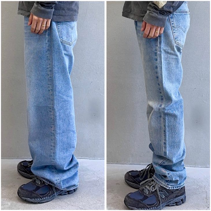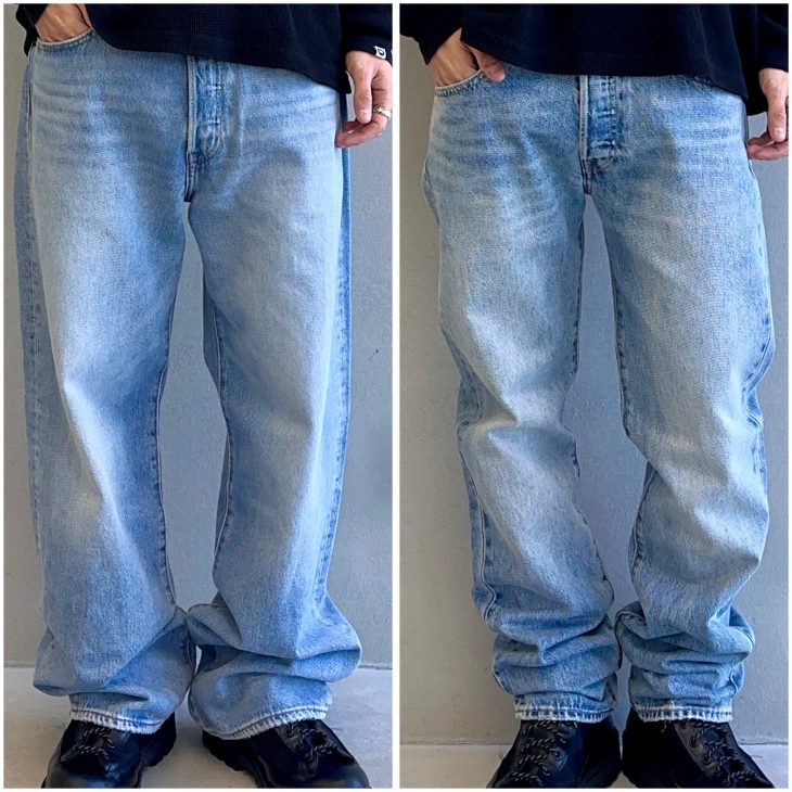 写真右501®Original(レギュラー)と比べると、この様にヒップから裾にかけてゆったりとしたルーズシルエット。