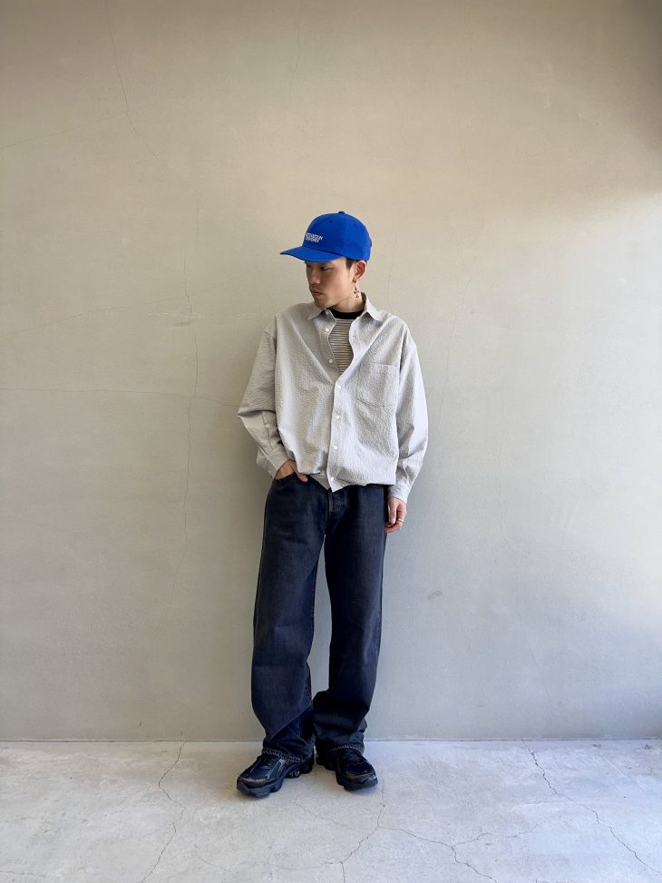 インディゴ×シアサッカー素材のシャツを合わせた清涼感のあるカジュアルスタイル。