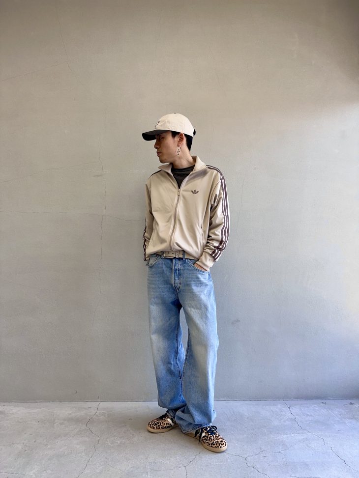 ライトブルーデニム×ベージュトラックジャケットを合わせた爽やかな大人のスポーツ MIX。