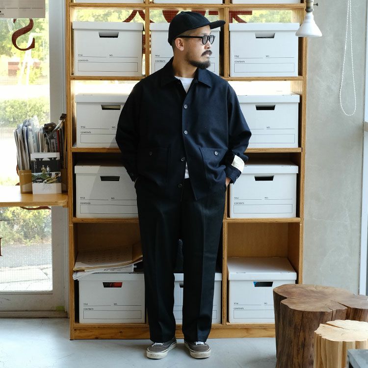 シャリ感があり、光沢とハリのある肌触りがいい生地。軽量なのでシーズン通して羽織れるので長く使える仕様になっています。同シリーズのイージーワイドテーパードパンツとセットアップで合わせるのもおすすめです。