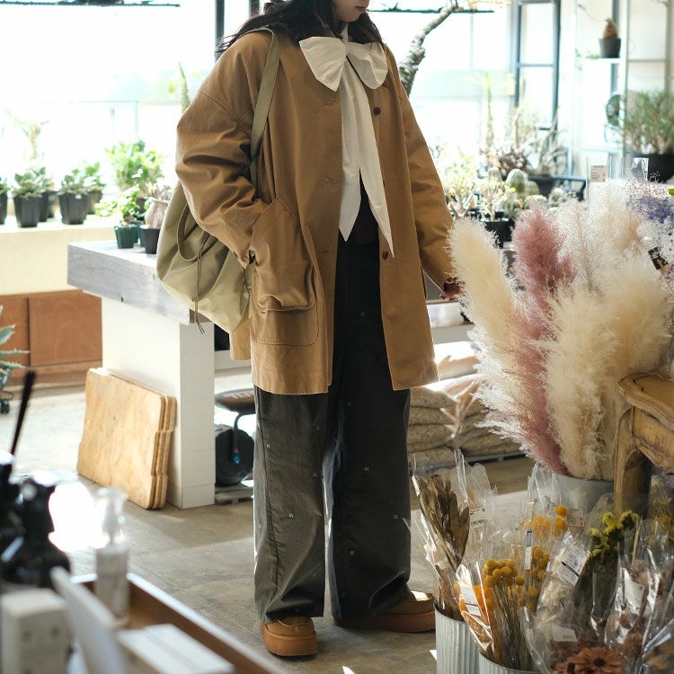 全体に散りばめられたKモチーフ刺繍が、素材の深みを引き立てながら、スタイリングに程よい遊びをプラス。
