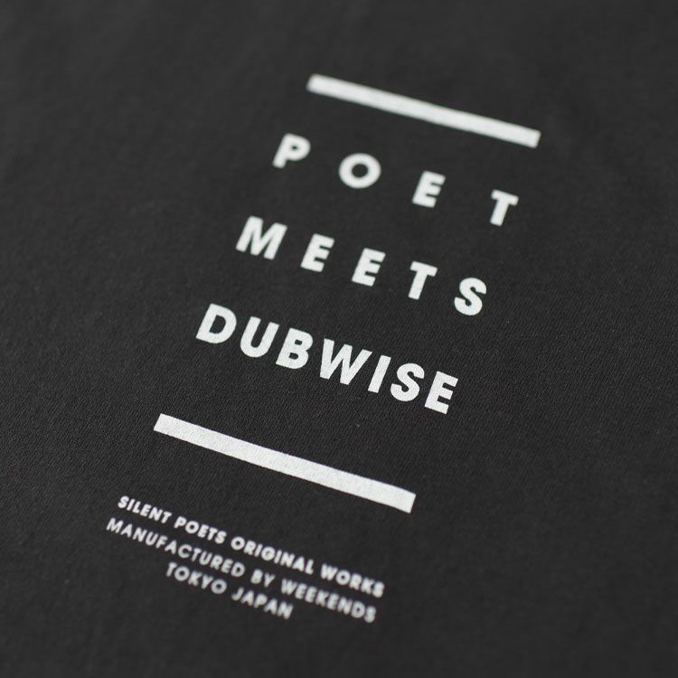 POET MEETS DUBWISE(ポエトミーツダブワイズ) メランコリックでエモーショナルなDUBサウンドを表現するSILENT POETSこと下田法晴によるオリジナルブランド。1990年代からDJ・ミュージシャンとして活動してきた下田はグラフィックデザイナーとしてのキャリアも長きにわたる。POET MEETS DUBWISEは音楽とデザイン、そしてカルチャーが常に隣り合わせにある下田のキャリアそのものが表されたプロジェクト。機能美や着心地を必要最小限にとどめたベーシックなアイテムには、SILENT POETSから連想されるキーワードや曲名をタイポグラフィとしてデザイン。感覚的に染み付いたコラージュやグラフィックデザイン的アプローチに基づくプロダクトは流行に左右されない表現だ。目まぐるしく変化するファッショントレンドとは無縁な位置から、独自のスタンダードを提案していく。