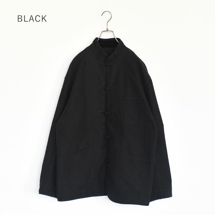 立ち襟やチャイナボタンなど特徴的なディテールを残しつつ、身幅・肩幅にゆとりを持たせた絶妙なサイズバランスで、肩肘張らずに着られる一着に仕上げています。