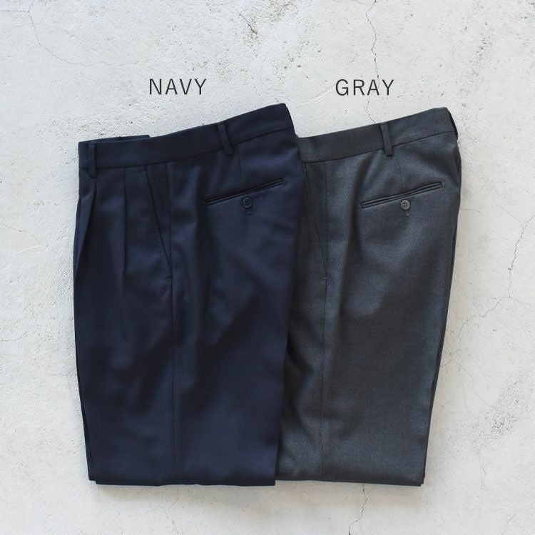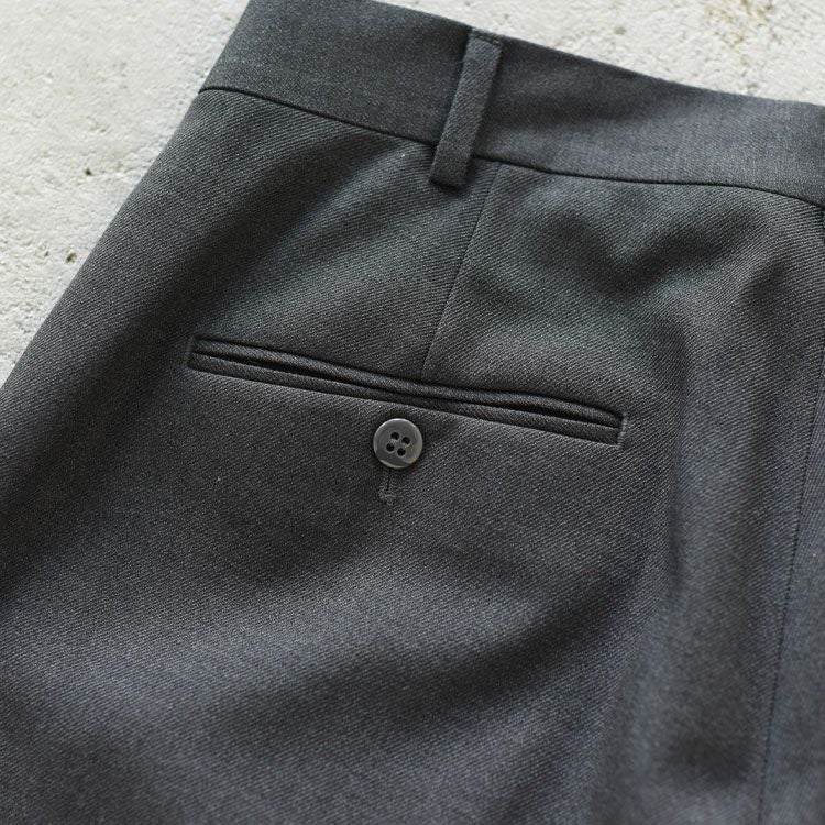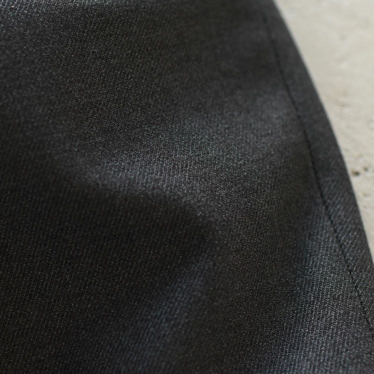 ウールとポリエステルの混紡糸を経糸と緯糸に使用して織り上げた先染めのサージ素材を使用。通常の規格よりも打ち込み本数をあげることで、しっかりとしたハリ感と重量感が生まれました。仕立ての良さが、シンプルなコーディネートをぐっと引き立てる、大人のための進化系CHRYSLER PANTSです。