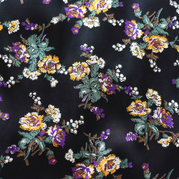ウエストには程よいギャザーを入れました。後ウエストはゴム仕様のため履きやすく快適な着心地です。レーヨン100%の控えめな光沢感のサテン生地にフラワーブーケ柄をプリント。Tシャツともニットとも相性抜群の、秋の始まりにぴったりな華やかでいてシックな一枚です。
