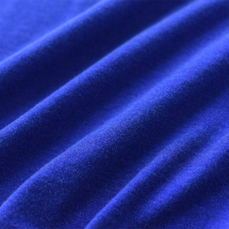 少し光沢のあるヴィンテージ感の素材は、レーヨンとコットンのプレーティング天竺で、表側にレーヨンを使用しているため光沢があり、裏側はコットンでナチュラルな肌触りを実現しています。柔らかなレーヨンコットンがしなやかなドレープと心地よい肌触りを演出し、フットボールのユニフォームに使われる生地を模して作られています。