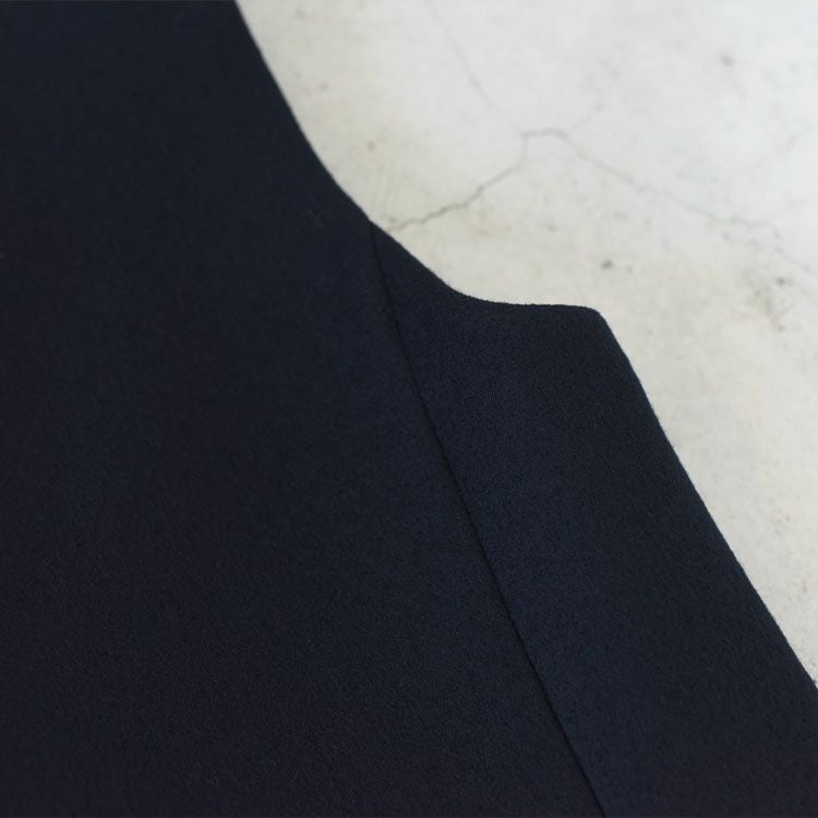 メリノの梳毛(そもう)糸を使用した、圧縮メルトン素材のロングジレ。しっかりした素材感を感じさせながら、見た目に反し薄くて軽いのが特徴です。ロング丈にセンターフロントのラインスリットを入れたことで、重さを感じさせません。ミニスカートを合わせてドレス風、またパンツに合わせてマニッシュにと、いろんな表情で楽しんでいただけます!