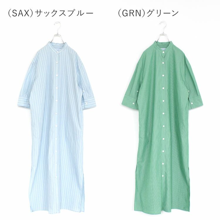 バンドカラーで首元がすっきりとした清涼感のあるロングワンピース。