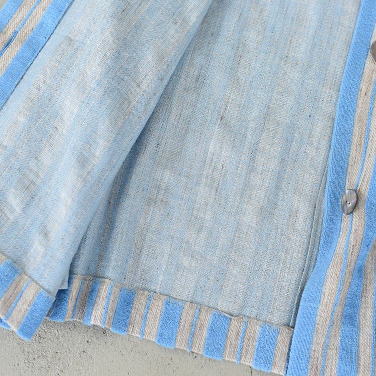 <生地説明> タテ糸に綿、ヨコ糸に麻で織ることで速乾性の高く、さらっとした生地に 仕上げました。綿と麻でボーダー(ストライプ)を表現。 タオルは綿100%で織りあげることが多いので。タオル用の織機に異素材を入れて織ること自体が至難の業でした。綿と麻の糸の伸度が違うので調子が難しく、試作の段階で何度も糸が切れてしまい、非常に苦労しました。繊細な麻なので、麻糸に特殊な補強をし、織りやすいように工夫をした素材です。