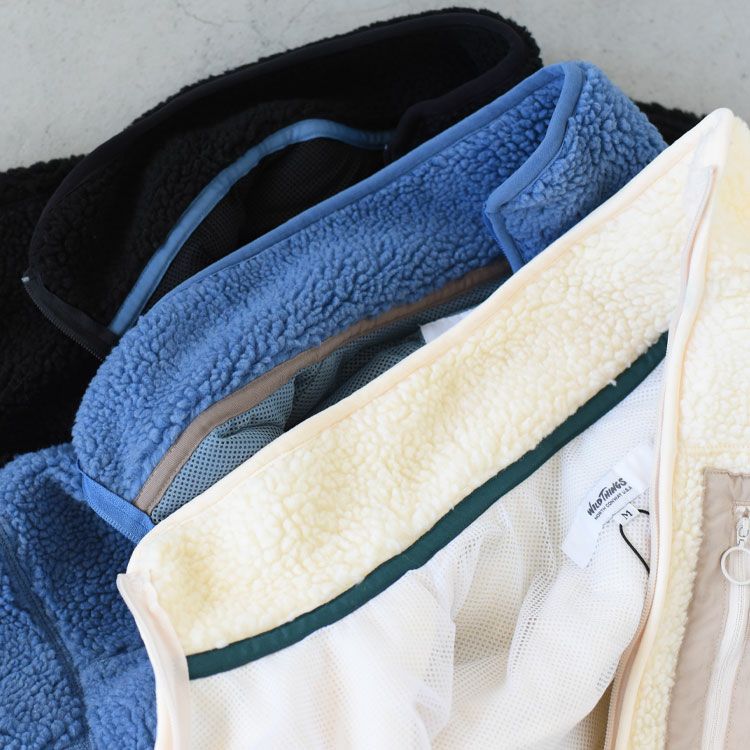 柔らかい風合いとボリュームが特徴のボアを使用したロングコート。 裏地は肌離れの良さとボアの軽さを活かすためメッシュを採用。 別布配色やパイピング、ファスナーポケットでWILD THINGSらしい アウトドアな雰囲気を感じられる一着。