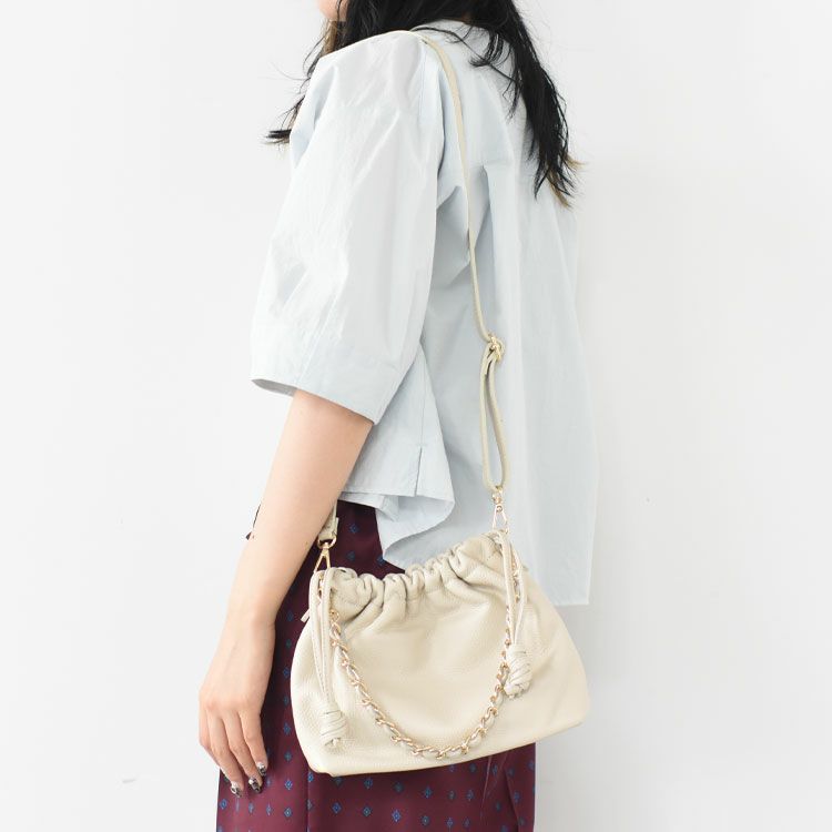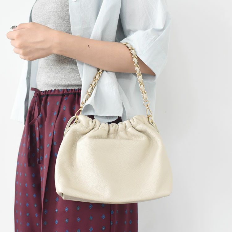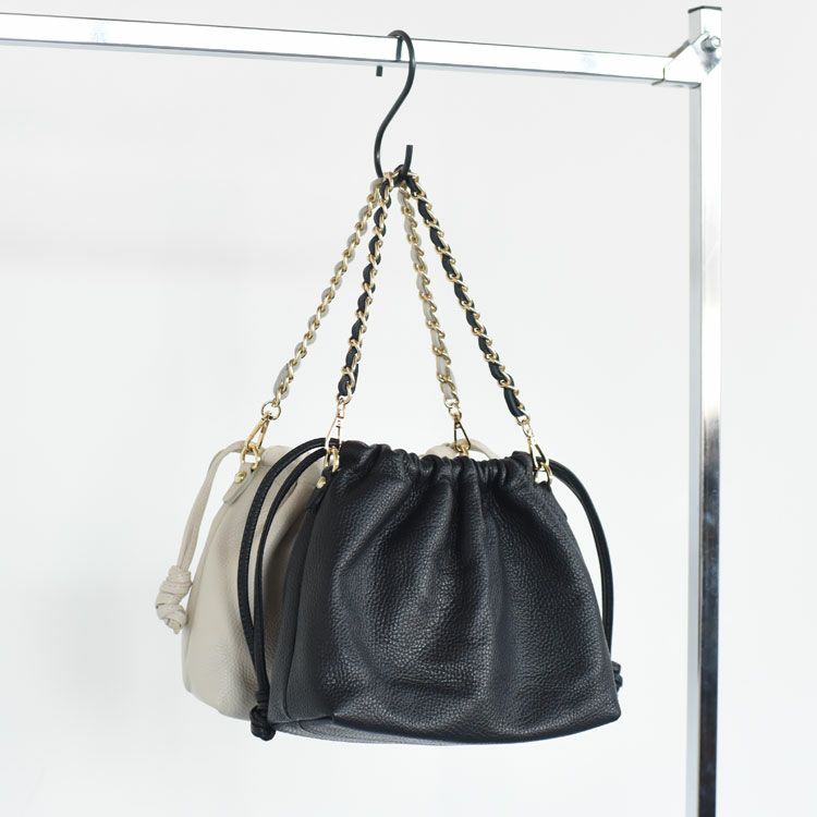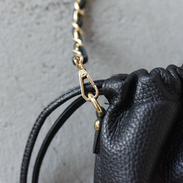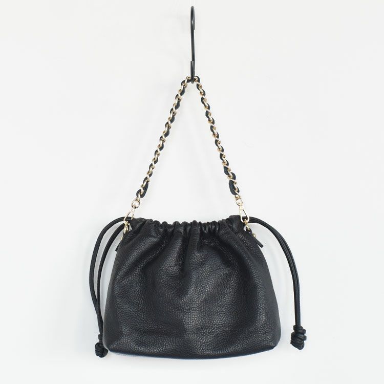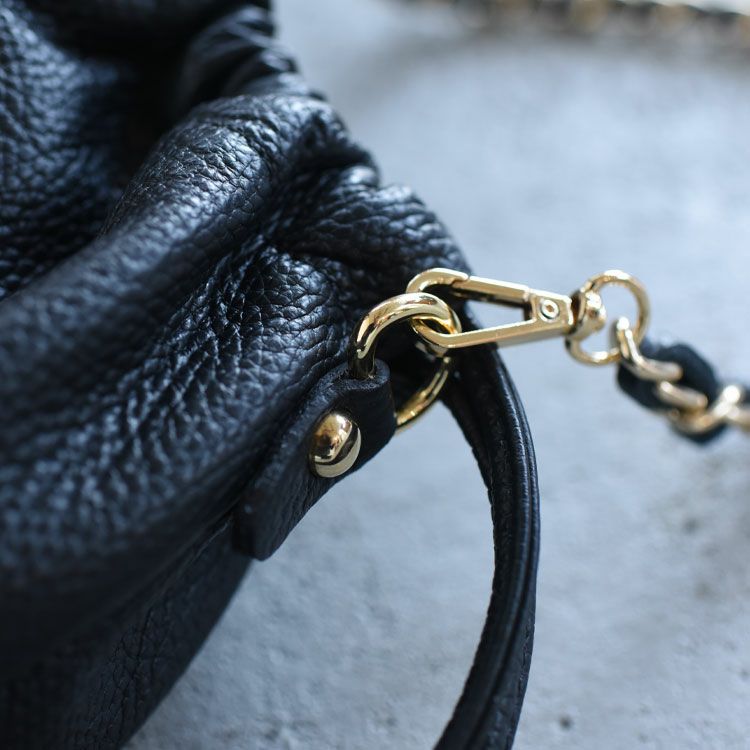 上質なイタリアンレザーにシボ加工を施した巾着バッグ。取り外し可能なチェーンストラップでショルダーにもできる2WAY仕様で、お出かけに合わせて持ち方を選べます。見た目以上の収納力があり、長財布や横置きペットボトルもすっきり収まるのに驚き。重さ約390gという軽さも嬉しいポイント。上品で華やかなチェーンのアクセントが、コーディネートのアクセントにぴったり。デイリーからちょっとしたお出かけまで、幅広く活躍します。モデル着用サイズsize:ONE color:NEROMODEL DATA height:172cm