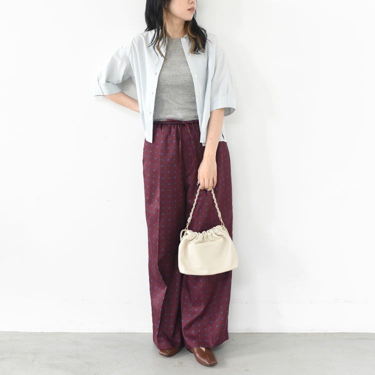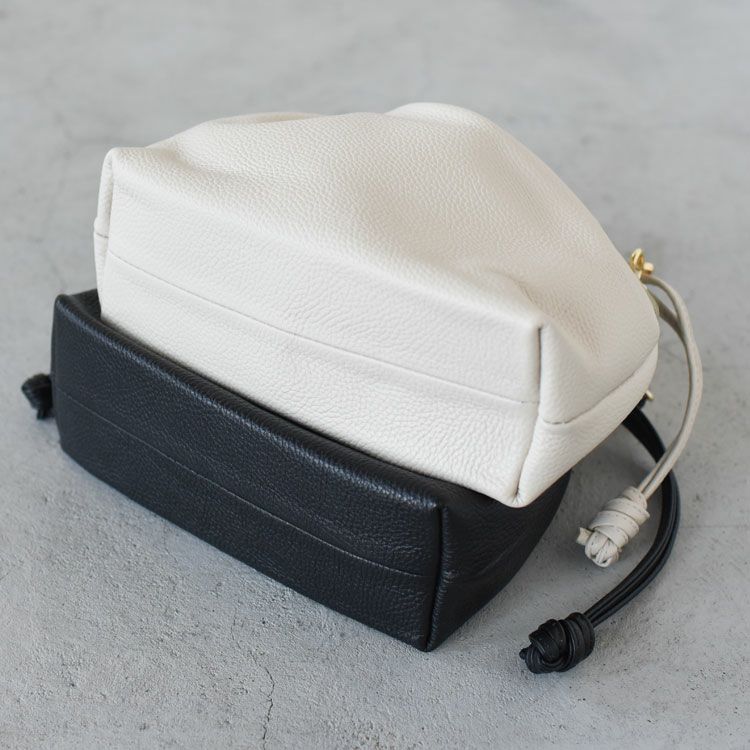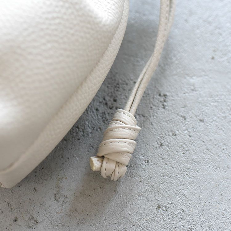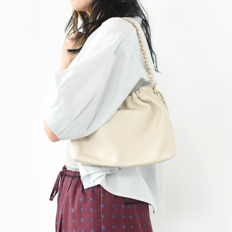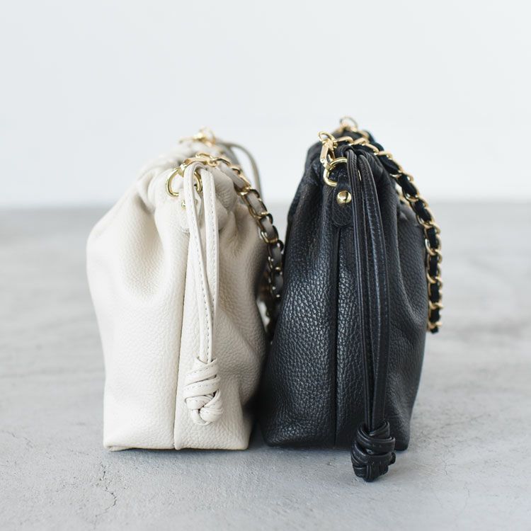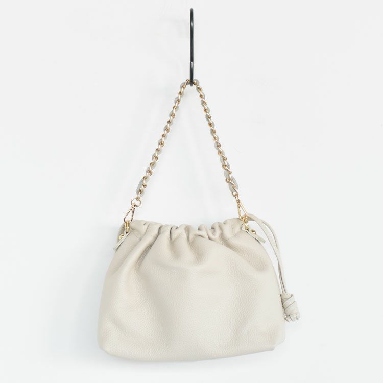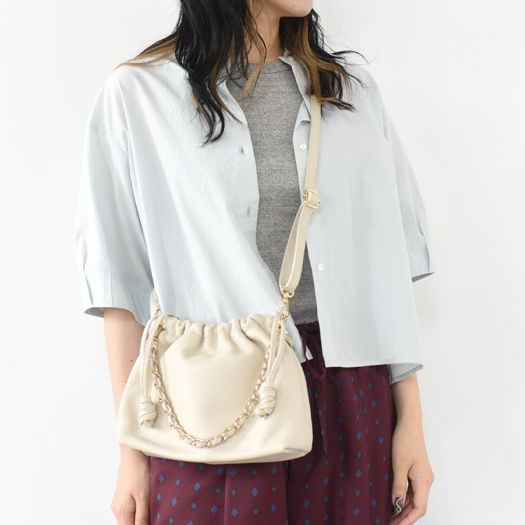 上質なイタリアンレザーにシボ加工を施した巾着バッグ。取り外し可能なチェーンストラップでショルダーにもできる2WAY仕様で、お出かけに合わせて持ち方を選べます。見た目以上の収納力があり、長財布や横置きペットボトルもすっきり収まるのに驚き。重さ約390gという軽さも嬉しいポイント。上品で華やかなチェーンのアクセントが、コーディネートのアクセントにぴったり。デイリーからちょっとしたお出かけまで、幅広く活躍します。モデル着用サイズsize:ONE color:NEROMODEL DATA height:172cm