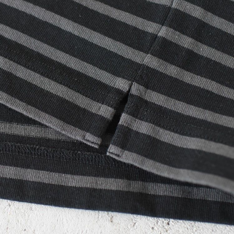 ボーダー素材を使いカラビナつきのポケットを胸につけたTシャツです。