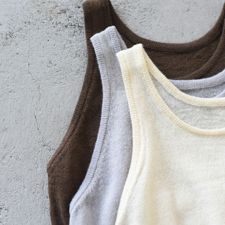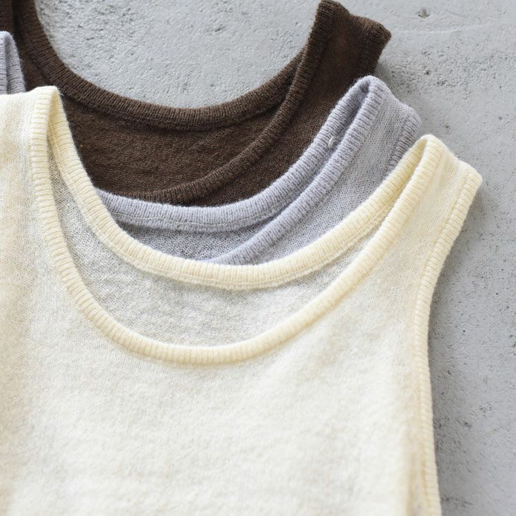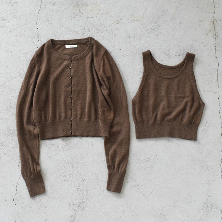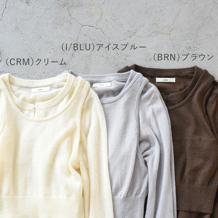 コンパクトなクルーネックカーデとタンクトップをレイヤードしたニットトップス。細番手のモヘア糸をミックスし、柔らかな風合いに仕上げました。タンクトップの上からカーデを羽織ったり、それぞれ単品使いしたりと、一つで幅広い着こなしを楽しんでいただけます。モデル着用サイズsize:F color:(CRM)クリームMODEL DATA height:170cm