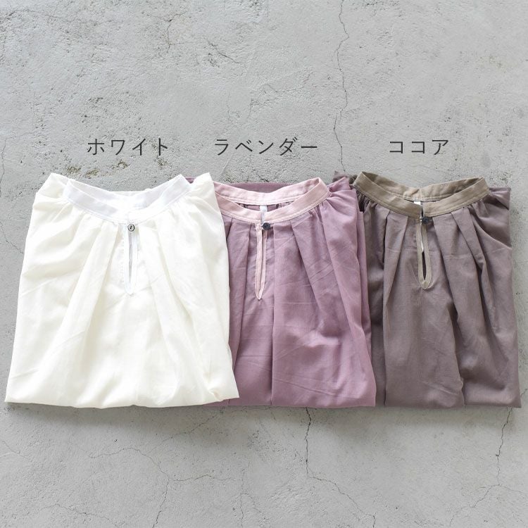 前後の衿ぐりにたっぷりとギャザーを入れたエアリーなシルエットが魅力。両サイドの裾にはスリットあきが入ったデザイン。
