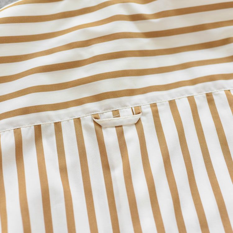 ストライプ:ハイカウントT/Cブロード。高密度に織られた綿混の平織りのブロードです。ハリ・コシがありつつも滑らかなタッチが高級感を生み出します。