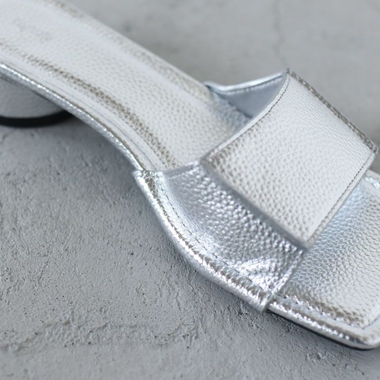 アウトシームデザインがポイントのスクエアサンダル。ブラックとクリームはフラットでツヤ感のあるエナメル調のエコレザー、シルバーはシボ感のあるエコレザーを使用しています。程良い高さのヒールで歩きやすく、女性らしいスタイルに。ソックス合わせもおすすめです。