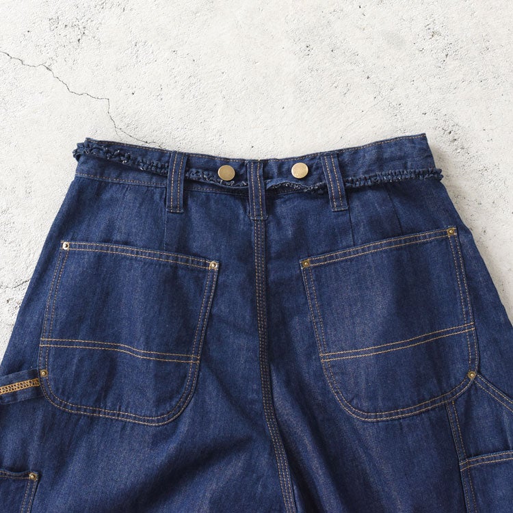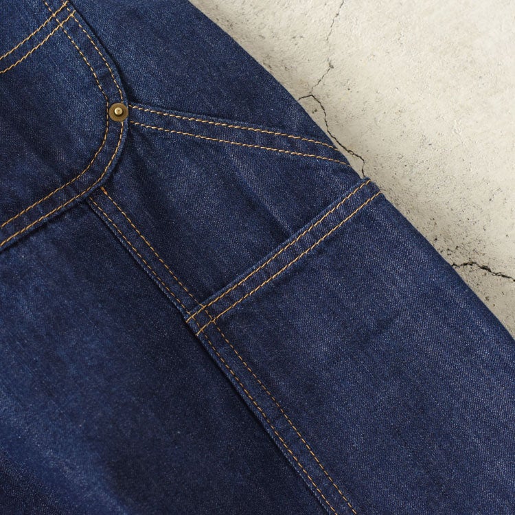 「ダブルニー」という男性的なワークパンツのデザインをライトなテクスチャーでお作りすることでトップスを選ばずどんなスタイリングにも活躍するデニムパンツに仕上げました。