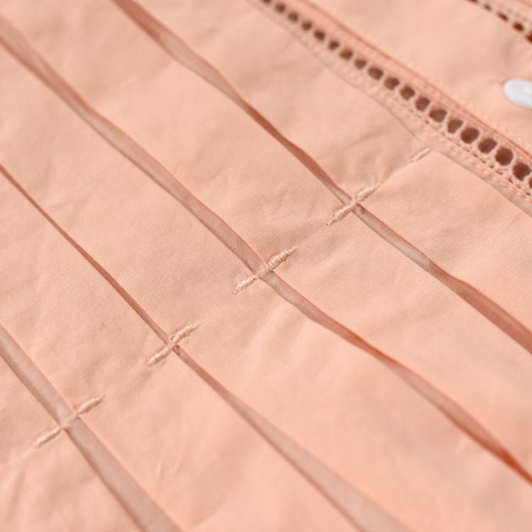 フロントには細かなピンタック(BOXタック)を贅沢に配置し、一本一本に閂(かんぬき)ステッチを施すことで、クラフト感と上品さを両立。さらに、パーツ同士をハシゴレースで接いだディテールが軽やかで女性らしい印象を引き立てます。
