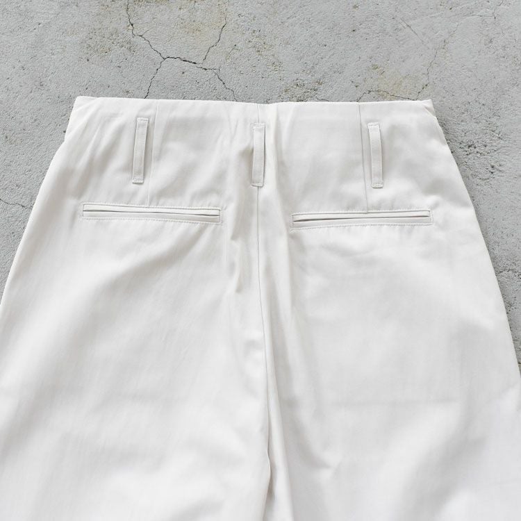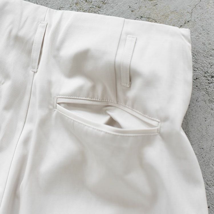 しなやかでこしのあるツイル素材を使用したワイドパンツ。ミニマルで幅広いトップスと合わせやすく着まわし力ある1本。ウエストの変形タックデザインが、トップスインしたりベルトをつけた際のポイントに。カジュアルな印象を纏いながら、控えめなステッチにすることで上品な仕上がりに。ほんのりとグレーがかったアイボリーとやわらかな印象のベージュの2色展開。ラフなシルエットで着こなしに自然な抜け感をプラスしてくれます。