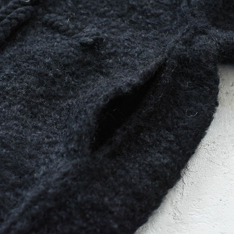 モヘアの大きなループヤーンとシェットランドウールを組み合わせて、アストラカン調の編み地に仕上げたローゲージニットです。型崩れしにくい度目の詰まった編み地にするために、あえて繊維が太く、ハリコシのある成獣のモヘアと、弾力性と耐久性に優れた硬い毛質が特徴のシェットランドウールを使用しています。見た目のボリュームに反してとても軽く、モヘアの光沢が美しい、非常に暖かい素材です。