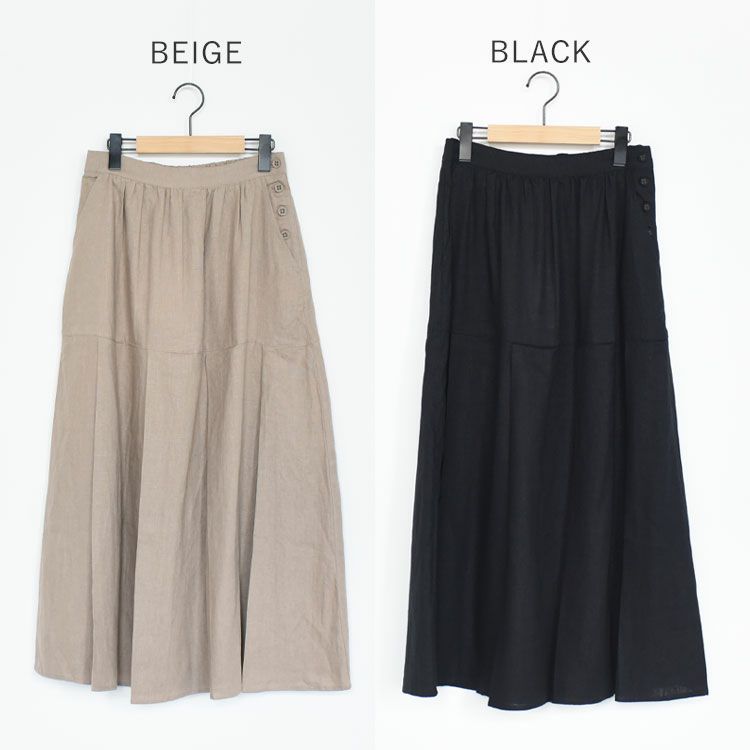 太めのリネン糸を使った中肉厚生地で、リネン特有のさらりとした肌触りとシャリ感のある風合いが魅力です。腰まわりをすっきり見せるヒップラインの切り替えと、足元に軽やかなニュアンスを添えるタック使いが特徴です。左脇のボタンがさりげないアクセントとなり、ウエストは後ろゴム仕様で前に調節可能な内紐が付いています。