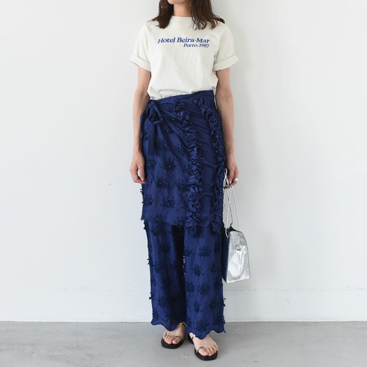 crinkleのシグニチャーである3Dフラワーの刺繍をインドのレーヨンシャンタンに施したエプロンスカートです。