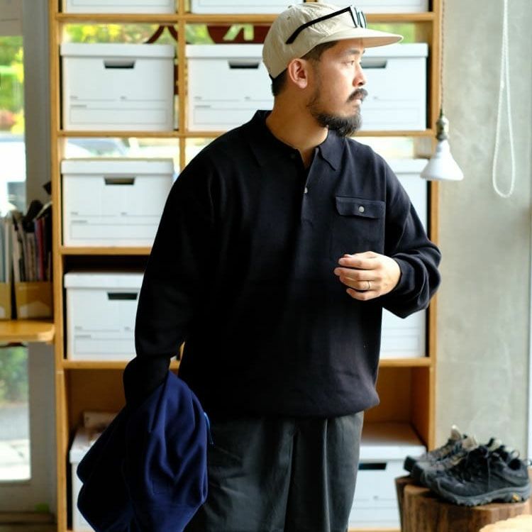ニットの長袖ポロ。胸のフラップポケットを高目に配置し、クラシックな印象に裾部分にストレッチ糸をプレーティングする事で波打ちづらく、まとまりが良いです。