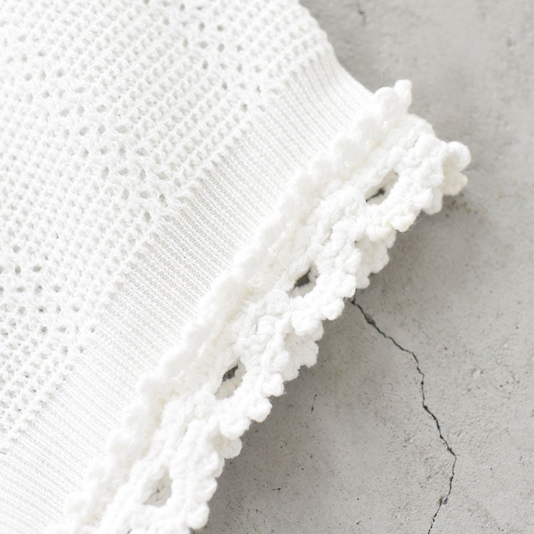 ふくらみと弾力のある糸を使っており、コンパクトなサイズ感ですが、立体的なフォルムに仕上がっています。 襟ぐりと袖口には、手編みのかぎ針モチーフレースを付けて華やかな印象に。羽織としてはもちろん、ボタンを閉じてトップス感覚でも着用していただける便利なニットです。