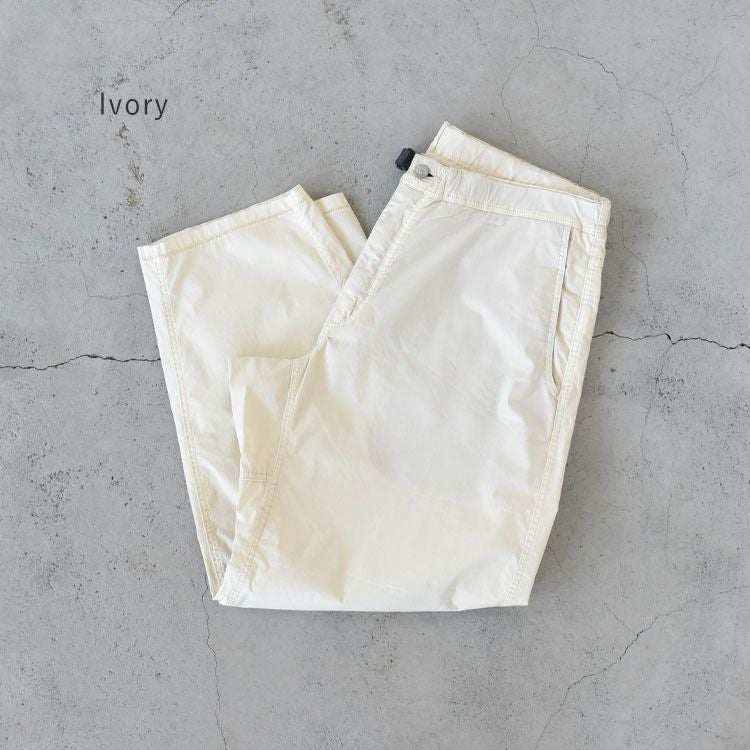 ストーンマスターの代表作「SM HYBRID PANT」。このハイブリッドシリーズの生地は薄くて頑丈。さらに速乾性とストレッチ性に優れたファブリックでストレスフリーなイージー仕様です。ナイロンとコットンを混紡したハイブリット素材。そこにヴィンテージのようなピグメント加工を施すことで、アタリとパッカリングのある表情豊かな顔つきに仕上げています。難しいとされるナイロンへのピグメント加工ですが、高い染色技術がそれを可能にしました。 また、生地の薄さを活かし、タッセルが付属している後ろ左ポケットに収まるポケッタブル仕様。ふさふさしたジッパープルが目印です。