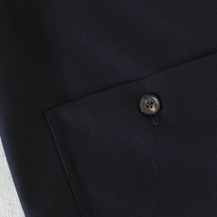 シャリ感があり、光沢とハリのある肌触りがいい生地。軽量なのでシーズン通して羽織れるので長く使える仕様になっています。同シリーズのイージーワイドテーパードパンツとセットアップで合わせるのもおすすめです。