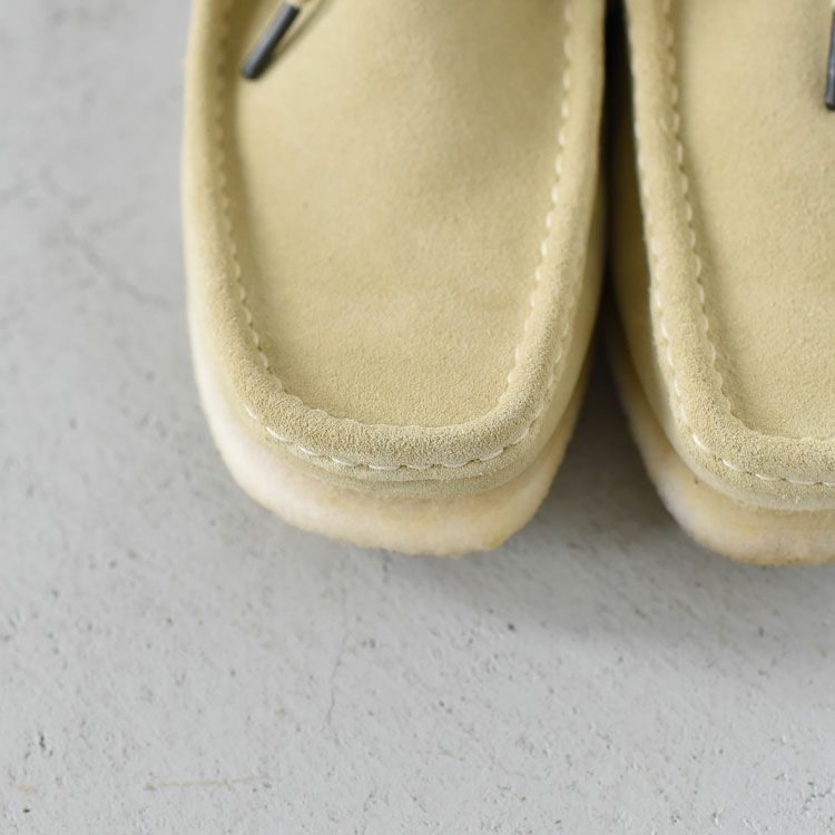 日本では1971年から販売しているClerks(クラークス)のオリジナル商品であるワラビーブーツ。カンガルーの小型有袋類ワラビーから命名されました。子供をお腹の袋に入れて大事に育てるように足を優しく包み込むような一足で、履いていてとても気持ちのいいシューズです。独特のモカシン構造のワラビーはクラークス オリジナルズ コレクションのアイコンシューズとして全世界で支持されています。シンプルでクリーン、履き心地の良いレースアップスタイル、クラークスオリジナルズの象徴であるクレープソールにシーズンごとのバリエーションを組み合わせ、今も進化しつづけています。Wallabeeは、くるぶしより下のローカット丈、Wallabee Bootはくるぶしより上のアンクルブーツ丈のスタイルとなっています。<メーカー品番> Maple:26155516 Black:26155517