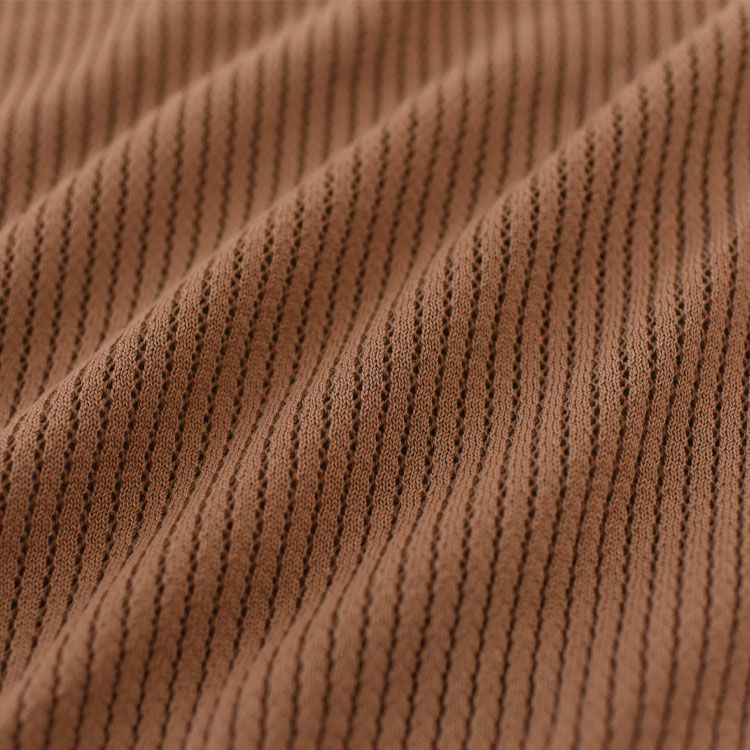 家庭での普通洗濯が可能な度詰めのストライプメッシュで春夏秋向けに薄手に編み立てられたニットプルオーバーです。