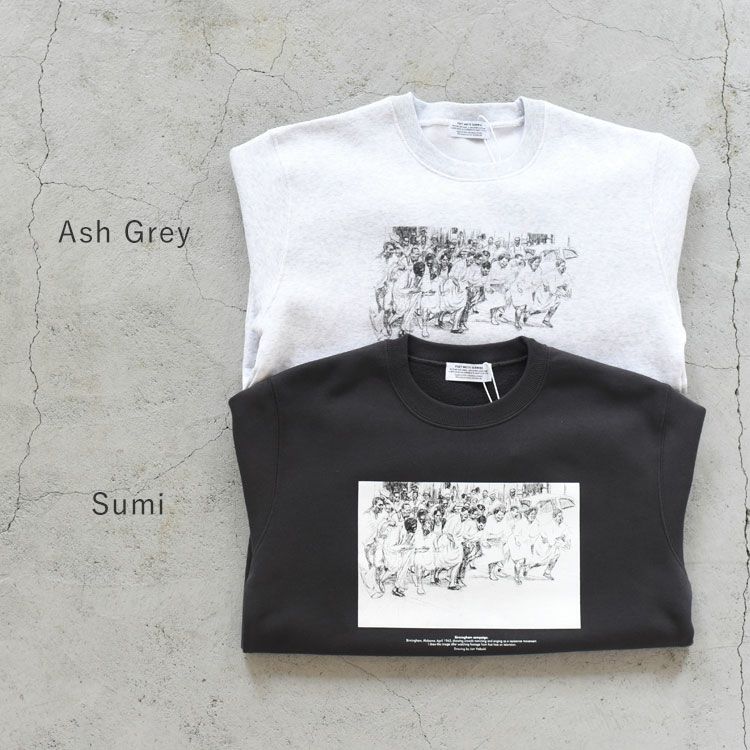 イラストレーターの矢吹純氏とのコラボレーション。フロントにプリントされたイラストは、1963年4月のアメリカ、アラバマ州バーミングハム、抵抗運動として歌いながら行進する群集の様子を描いたもの。綺麗な表面感とソフトな肌触りを追求した10 OZ裏起毛スエット。