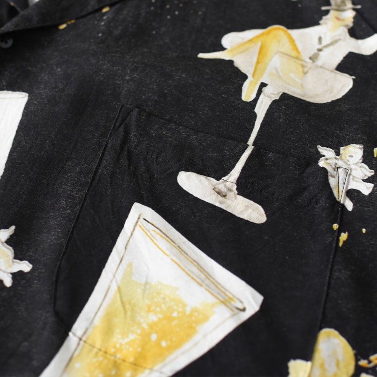 ポータークラシックのロゴデザイン等を手がけるmimone氏による、架空のシャンパンCUPIDONが描かれたアロハシャツ。栓を抜く、飛び回る天使、愉快で楽しい気持ちになれるイラスト。 ゆったりとしたシルエットにレーヨン特有の落ち感が相まって涼しげな印象を与えてくれます。 滑らかな肌触りと、光沢の美しさが際立つ一着。 存在感があるので、インナー使いできて暑い夏から秋冬までおすすめです。モデル着用サイズsize:L color:BLACKMODEL DATA height:170cm weight:68kg