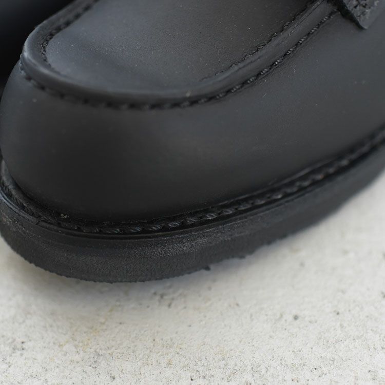 クラシックモックのシリーズに新しく仲間入りする#8074は、レザー本来の肌目を活かしたブラックのオイルドレザーであるブラック・ハーネスを使用。レザーに合わせてソールやステッチ、ハトメに至るまで全て黒で統一されたモダンな一足になっています。