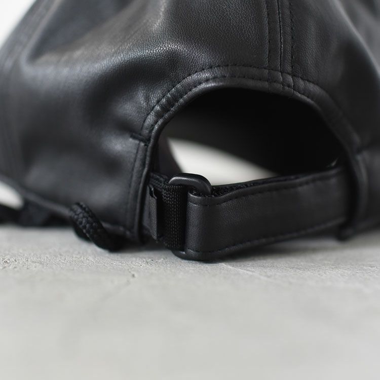動物に由来しない環境に配慮した合成皮革素材を使用。限りなく本物のレザーに近い光沢感、質感を表現したナッパラン風の加工仕上げ。 クラシカルな6パネルキャップ。アジャスター、ストラップディテールを加え、風に飛ばされないよう機能的にアップデート。モデル着用サイズsize:FREE color:BLACKMENS MODEL height:170cm weight:73kg