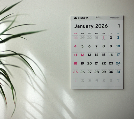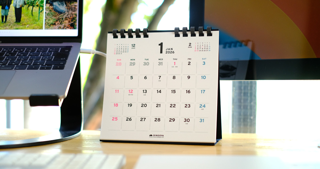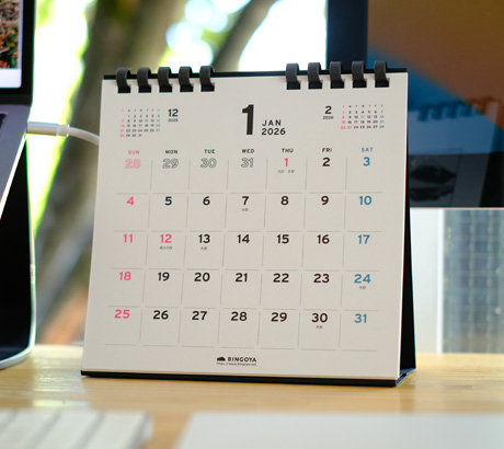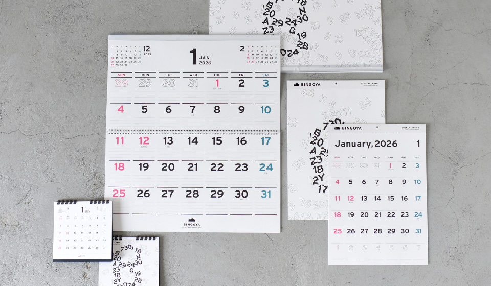 カレンダープレゼントキャンペーン 山陰でプレゼントし続けて20年以上、BINGOYAオリジナルカレンダー、是非お手にとっていただけると幸いです。 2026年もよい年にしていきましょう! 〈 キャンペーン限定中ご購入者された方に先着順でプレゼント 〉 【オンラインストアのお客様へ】 ※オンラインストアのお客様は、卓上カレンダーがプレゼント対象となります。カレンダーのサイズは選べません事ご了承ください。 ※もしカレンダーがご不要の場合は、お手数ですが購入画面の備考欄にて「カレンダー不要」とご入力ください。 ※ネコポス配送と、傘のみを購入された場合、カレンダーが入らないためプレゼント対象外となること、ご了承ください。 卓上カレンダー 中面はシンプルなデザイン。どんな部屋に置いても、浸透力抜群です! サイズ:ヨコ180mm×タテ190mm 壁掛けカレンダー(大) オリジナルカレンダー制作当初から変わらない壁掛けタイプ。スケジュールを書くエリアが大きく、メモしやすいのが人気の秘訣です。 サイズ:ヨコ530mm×タテ310mm 短冊月めくりカレンダー 短冊月めくりカレンダーは、壁に穴をあけなくとも、冷蔵庫の横に磁石でも貼り付け可能! サイズ:ヨコ297mm×タテ420mm 3種のカレンダーをご用意いたしました。沢山の皆様に使っていただけますように! ※実店舗でお買い上げのお客様には、卓上か壁掛けか短冊、好きなタイプを選んでいただけます。 ※カレンダーが無くなり次第終了となります